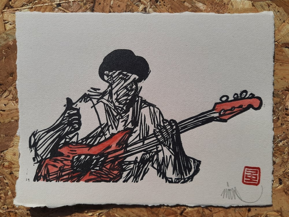 This linocut is a direct response to Marcus Miller's slapping fingers and his powerful sounds.